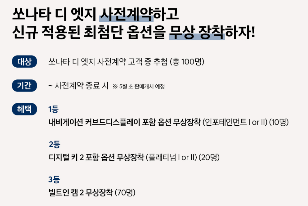 쏘나타 디 엣지는 8세대 쏘나타의 풀체인지급 부분변경 모델로, 날렵하고 직선적인 디자인과 차급을 뛰어넘는 편의, 안전사양을 제공한다. 특히, 쏘나타 디 엣지는 소프트웨어 중심 자동차(SDV) 기반의 편의 사양인 무선 소프트웨어 업데이트(OTA)를 전 트림에 기본으로 탑재하고 첨단 편의,안전 사양을 트림별로 대거 적용되었습니다.